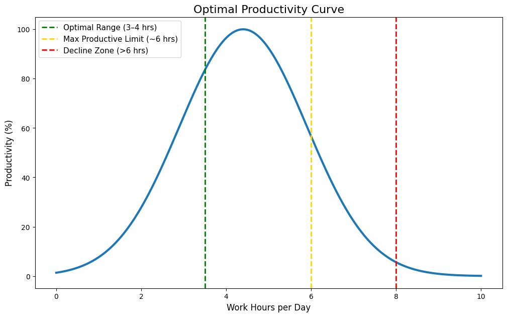 • Most productive range: 3–4 hours of deep, focused work per day (within the maximum productive hours for knowledge workers)